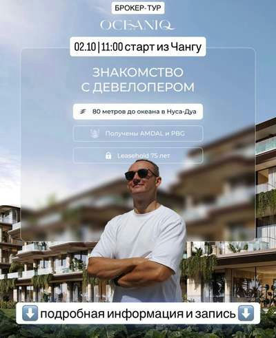 Тусовка агентов: как заработать на проектах OceaniQ 2 октября 2025 г. в 03:00 Oceaniq📍 ЖивойпрошлоВстреча в Чангу на фирменном авто. Поездка на объекты в Нуса Дуа. Лёгкий фуршет и нетворкинг на готовой вилле в комплексе OceaniQ I. Обратная дорога до Чангу. Количество мест ограничено.