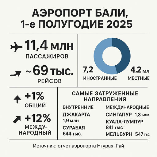 За 1-е полугодие 2025 через аэропорт Бали прошло 11,4 млн пассажиров